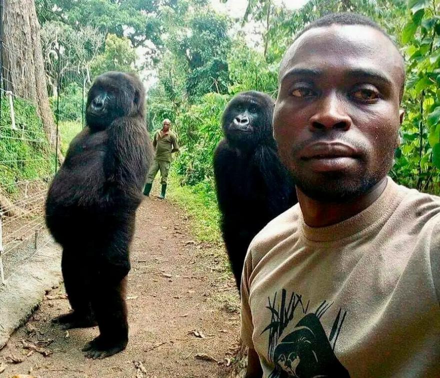 Δείχνει έναν δασοφύλακα του πάρκου, τον Mathieu Shamavu, με μπλουζάκι και να ποζάρει για μια selfie, με τους δύο γορίλες πίσω του. Ο ένας γορίλας κοιτάζει πάνω από τον αριστερό του ώμο, με το πηγούνι προς τα κάτω, με ένα βλέμμα μιας άλλης ημέρας, κοιτάζοντας προς την κάμερα. Ο άλλος γέρνει προς τα εμπρός, σαν να είναι αποφασισμένος να μπει στη φωτογραφία, με μια υποψία χαμόγελου στην άκρη του στόματός της. Γεια σας! Πίσω τους είναι ένας άλλος δασοφύλακας, με τα χέρια πίσω από την πλάτη του, κοιτάζοντας έντονα τη σκηνή.