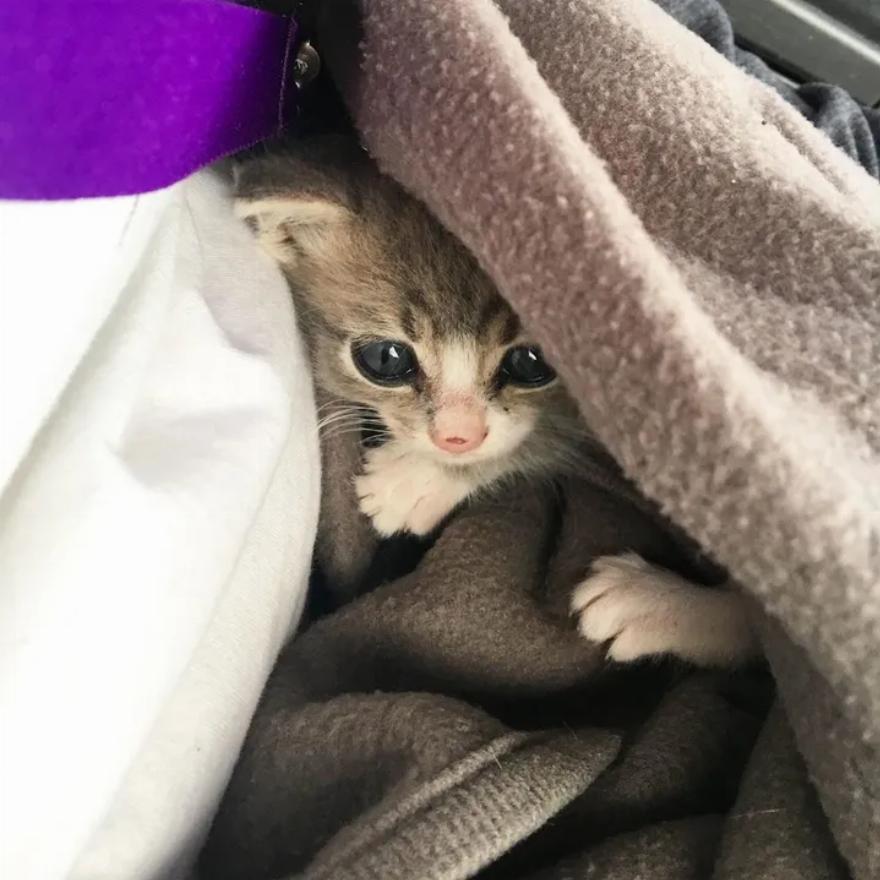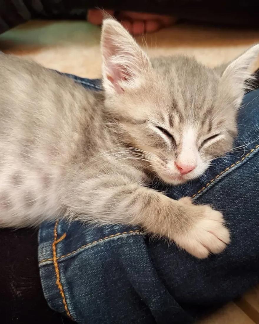 Το γατάκι δεν άργησε να βρεθεί στην αγκαλιά της θετής του μαμάς και να αποκοιμηθεί γρήγορα. Λίγες ημέρες μετά την άφιξή του, συστήθηκε στα νέα του αδέρφια. Τα πάνε όλα καλά μεταξύ τους.