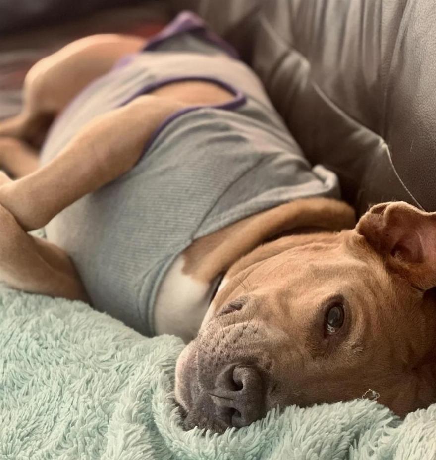 Ένα υιοθετημένο πιτ μπουλ αγκαλιάστηκε με την ανθρώπινη αδελφή του και χαμογέλασε, νιώθοντας ασφάλεια και άνεση στο υπέροχο νέο του σπίτι.