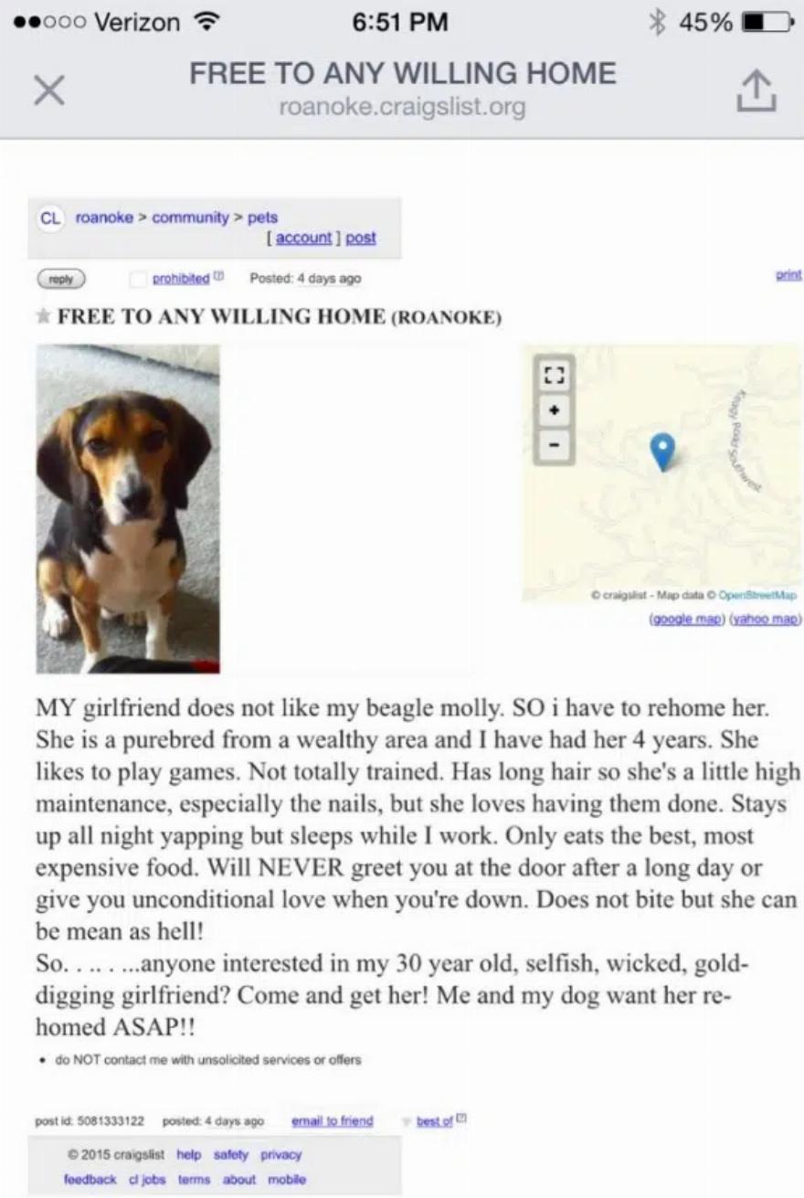 Η φίλη μου δεν συμπαθεί το μπιγκλ μου, τη Molly. Γι’ αυτό πρέπει να την επανατοποθετήσω. Είναι καθαρόαιμη από μια πλούσια περιοχή και την έχω 4 χρόνια. Της αρέσει να παίζει παιχνίδια. Δεν είναι πλήρως εκπαιδευμένη. Έχει μακριά μαλλιά οπότε είναι λίγο απαιτητική στη συντήρηση, ειδικά τα νύχια, αλλά της αρέσει να της τα φτιάχνουν. Μένει ξύπνια όλη τη νύχτα, αλλά κοιμάται όσο δουλεύω. Τρώει μόνο την καλύτερη και ακριβότερη τροφή. Δεν θα σας υποδεχτεί ΠΟΤΕ στην πόρτα μετά από μια κουραστική μέρα ή δεν θα σας δώσει άνευ όρων αγάπη όταν είστε πεσμένοι. Δεν δαγκώνει αλλά μπορεί να γίνει πολύ κακιά!