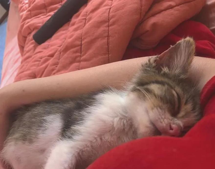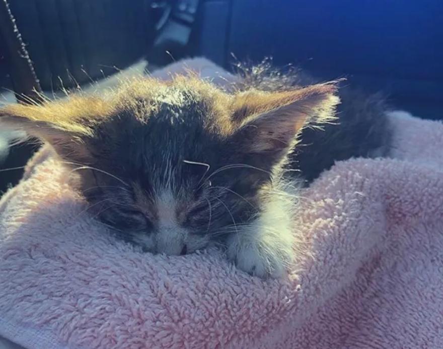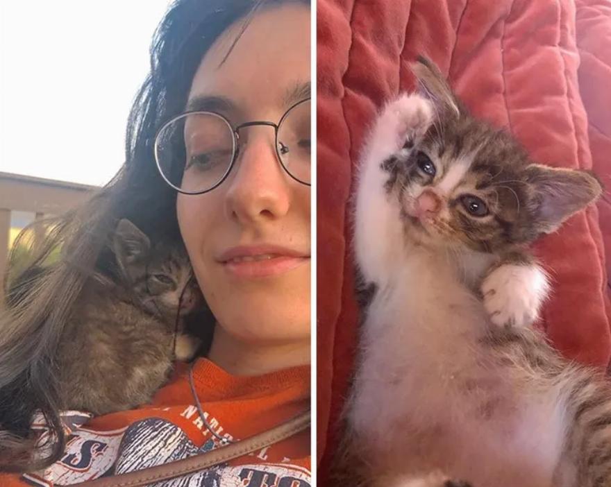 Το γατάκι ήταν βρώμικο και πολύ αδύνατο. Το ζευγάρι δεν μπορούσε να βρει τη μητέρα της γάτας και άλλα γατάκια στην περιοχή και ήξερε ότι έπρεπε να βοηθήσει. Το μάζεψαν και το έφεραν στο αυτοκίνητό τους. Η γάτα tabby κουλουριάστηκε στην αγκαλιά της Karianna σαν να ήξερε ότι ήταν ασφαλές.
