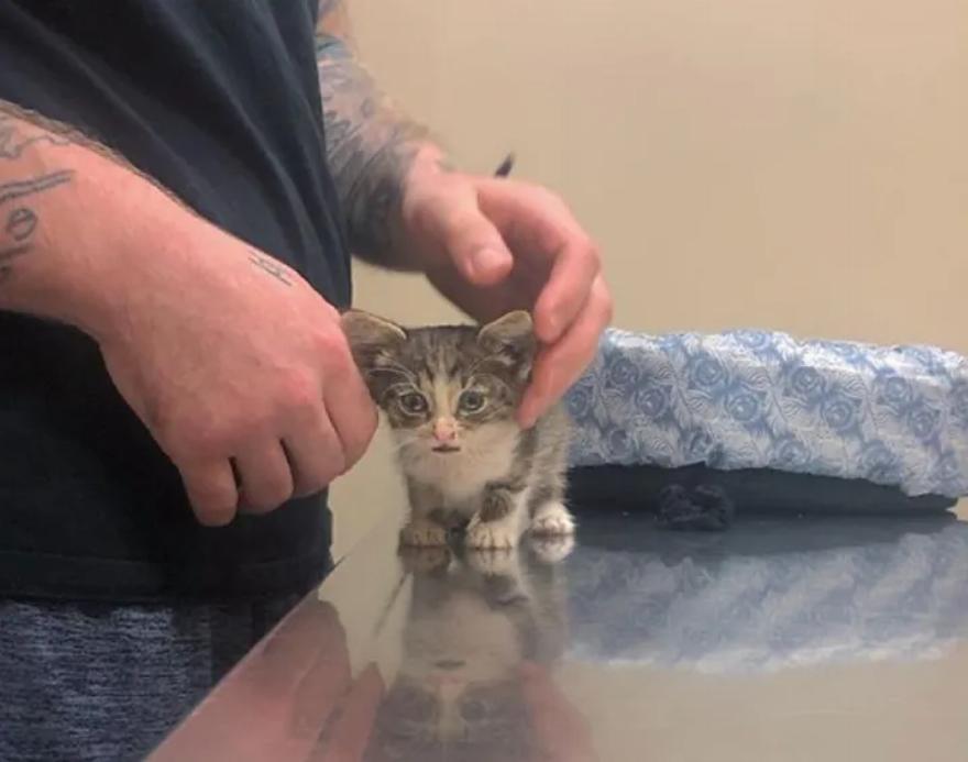 Το γατάκι εκτιμάται ότι ήταν περίπου έξι εβδομάδων. Ήταν καλυμμένο με ψύλλους, ακάρεα στα αυτιά και είχε μια ήπια περίπτωση δερματικής μόλυνσης.
