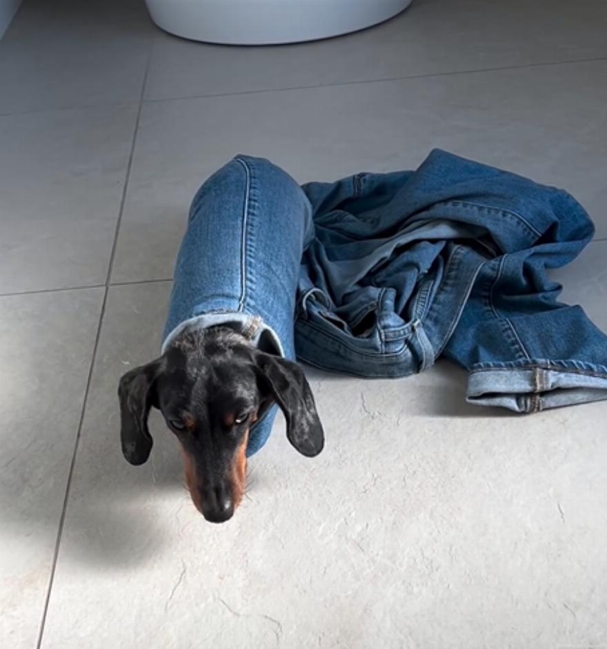 Ένα βίντεο με τον Μπιλ, τον σκύλο, έχει συγκεντρώσει πάνω από 13 εκατομμύρια προβολές στο Instagram. Φαίνεται να έχει μπει με την πλάτη του στο πόδι ενός τζιν παντελονιού. Ωστόσο, το να βγει από αυτό δεν είναι τόσο εύκολο.