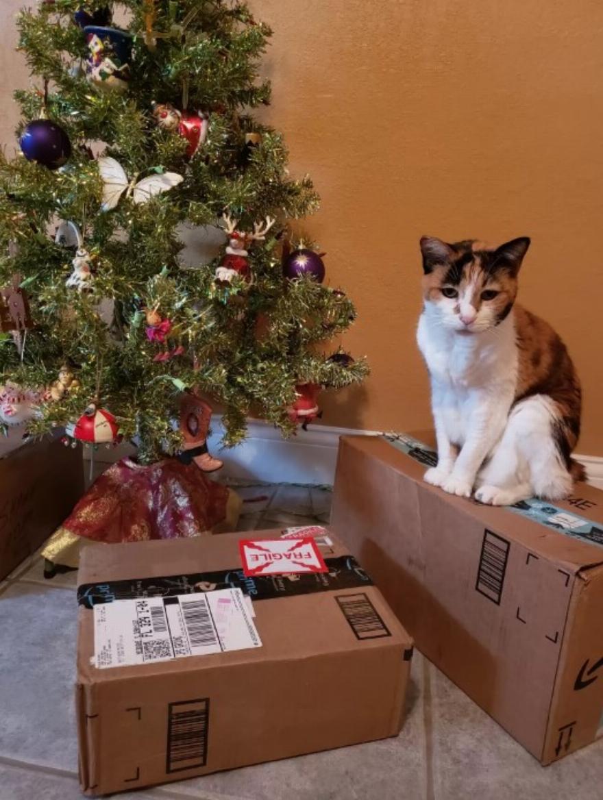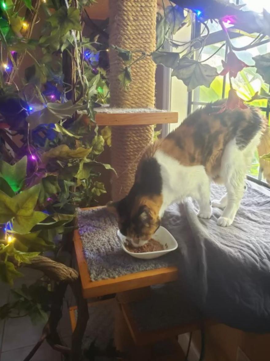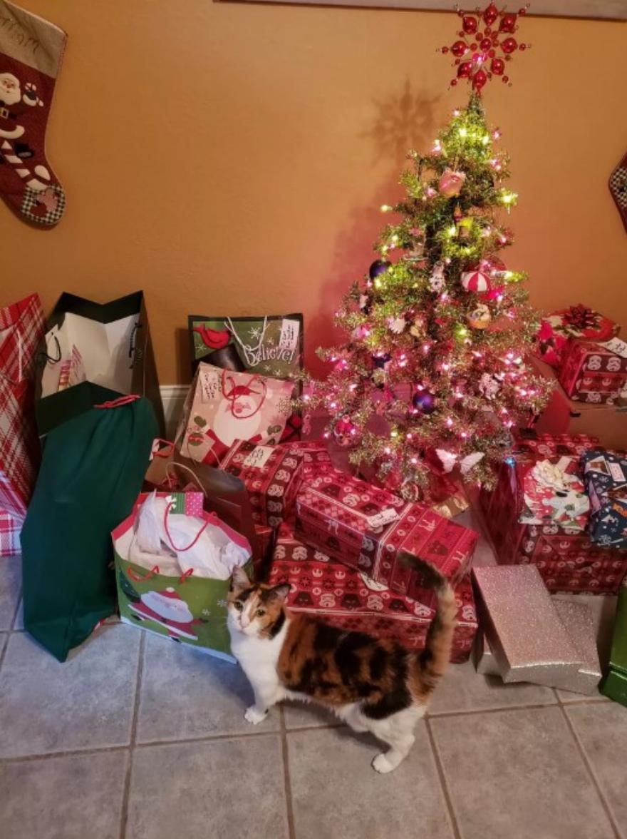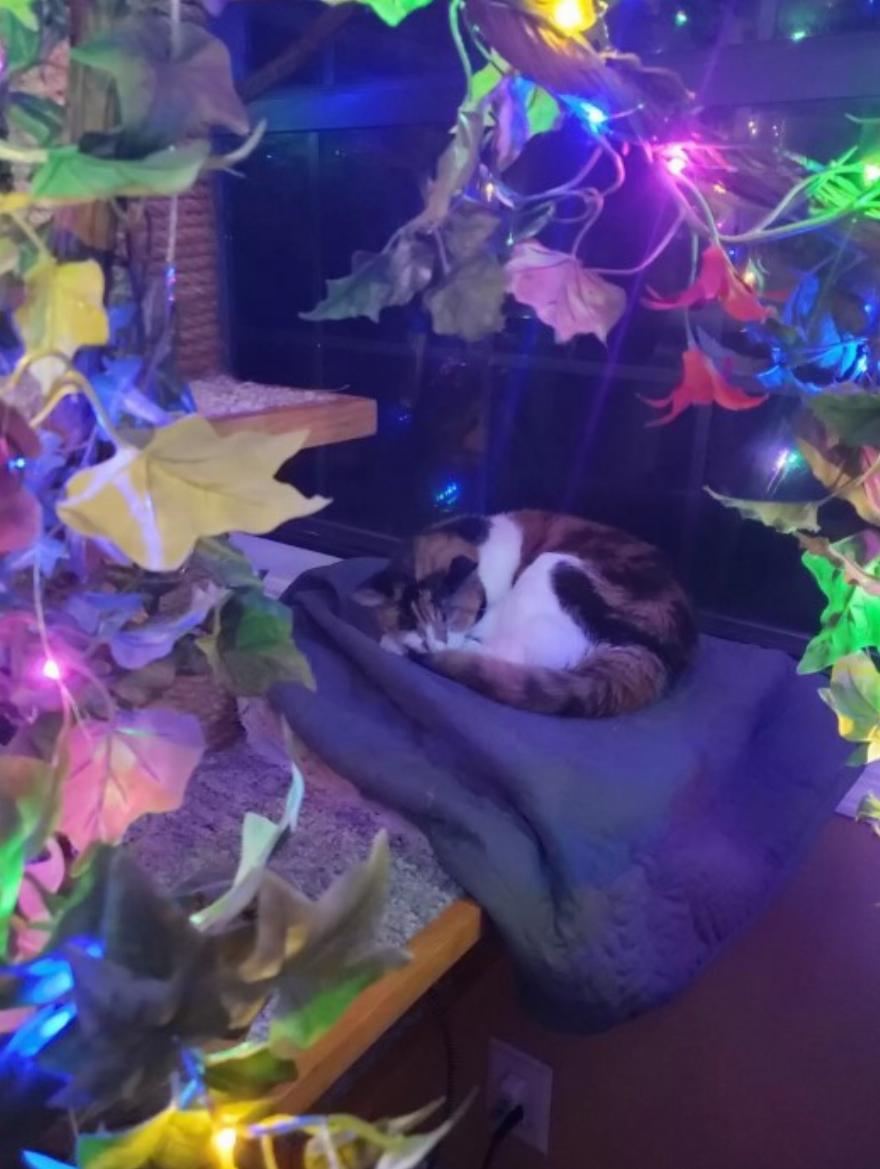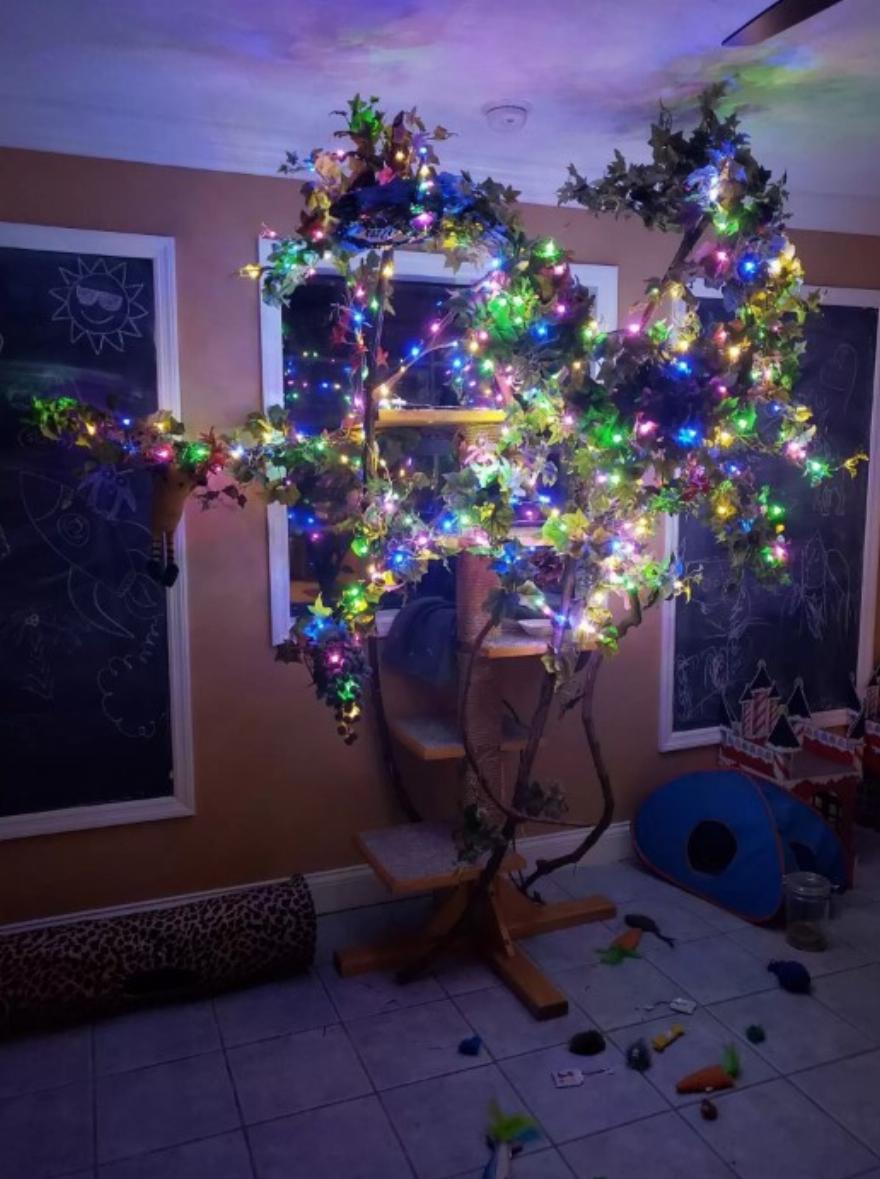 Η Luna έχει ένα ειδικό δέντρο για γάτες που στην πραγματικότητα έχει κλαδιά και φύλλα που το διατρέχουν, το οποίο οι γονείς της συνειδητοποίησαν ότι ήταν το τέλειο μέρος για να τοποθετήσουν μερικά μόνιμα χριστουγεννιάτικα φωτάκια.