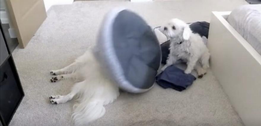 Ακούγεται ένα ανακάτεμα και ξαφνικά ο Μαξ αναποδογυρίζει το κρεβάτι ακριβώς πάνω στο άλλο σκυλί!