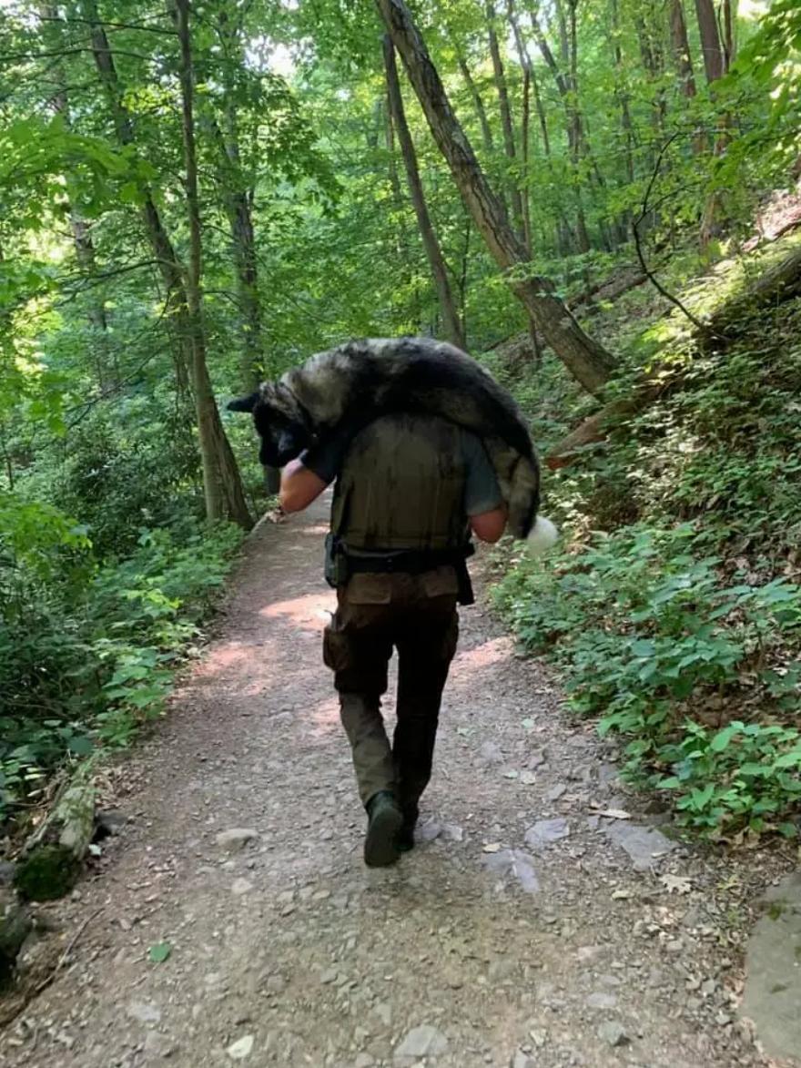 Και έτσι, ο Salapek σήκωσε τον Γερμανικό Ποιμενικό των 45 κιλών στους ώμους του και ξεκίνησε το επίπονο ταξίδι προς τα κάτω.