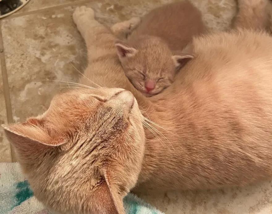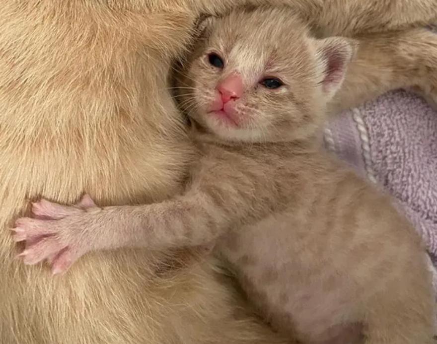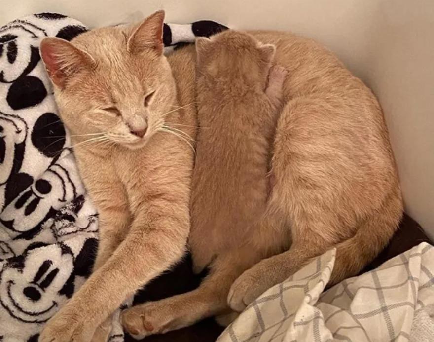 Η πορτοκαλί γάτα, ηλικίας περίπου ενός έτους, είχε αγκαλιάσει το μικρό της γατάκι, προσπαθώντας να το κρατήσει ασφαλές. Η Nisa Konuma, μια εθελόντρια της οργάνωσης, ανέλαβε να τα φιλοξενήσει όταν έμαθε ότι χρειάζονταν ένα μέρος για να μείνουν.