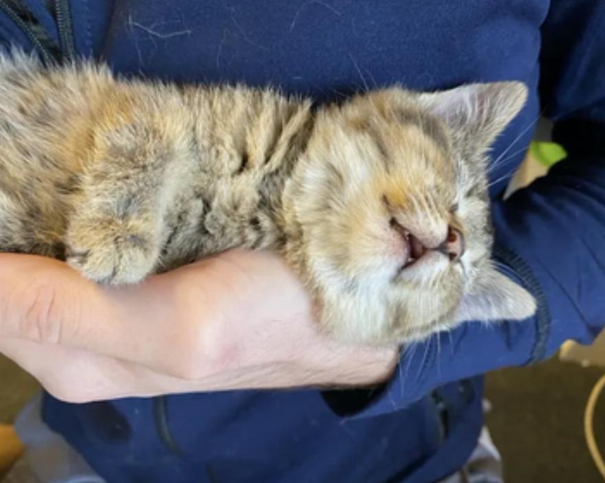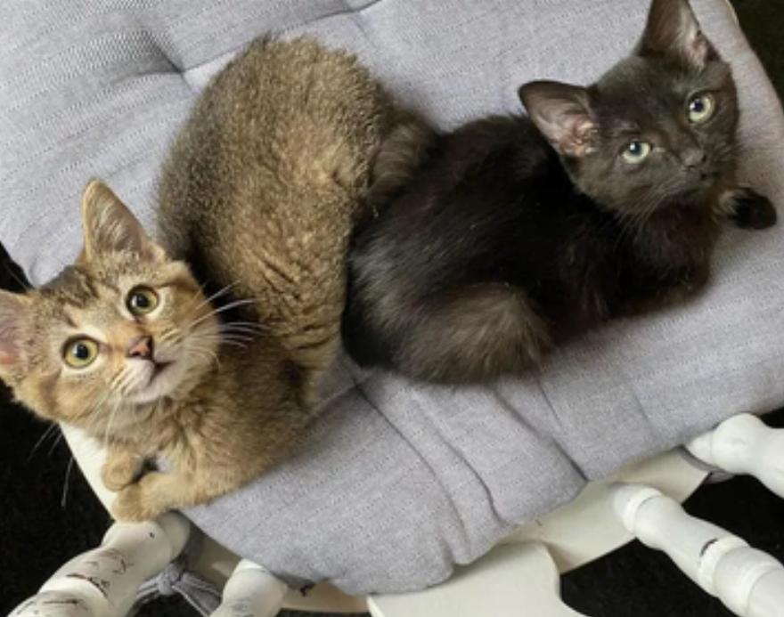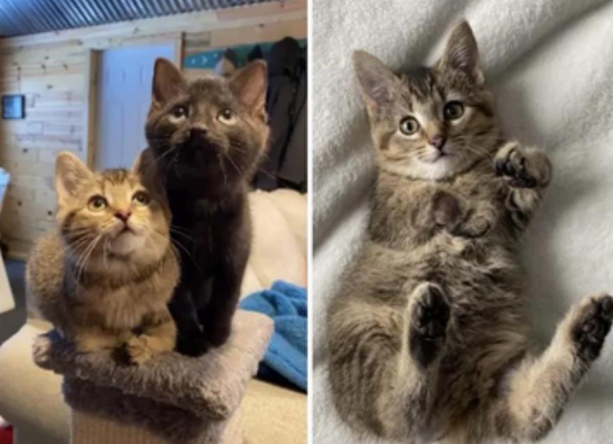 Τα δύο γατάκια ήταν περίπου 3,5 εβδομάδων και το tabby είχε εμφανή γενετικά προβήματα. Ήταν καλυμμένα με ψύλλους και βρωμιά και είχαν απεγνωσμένη ανάγκη από κατάλληλη τροφή και ιατρική φροντίδα.