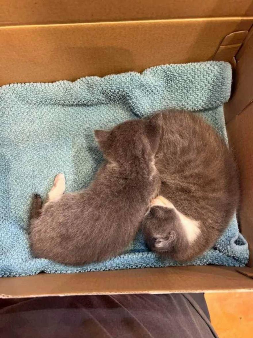 Συνέχισε να ψάχνει μέχρι που τελικά βρήκε την πηγή των κραυγών: δύο μικροσκοπικά γατάκια κουλουριασμένα σε μια μικρή μπάλα, που κρατούσαν σφιχτά το ένα το άλλο.