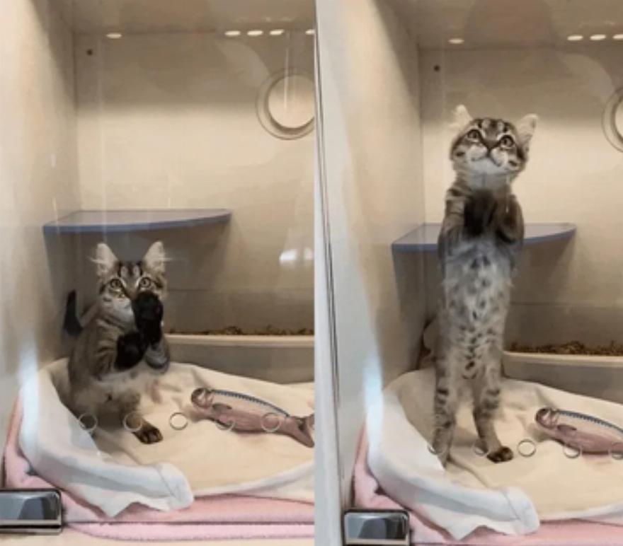 Κάθε φορά που περνάει κάποιος, τους χαιρετάει κουνώντας τις μπροστινές της πατούσες πάνω-κάτω στο τζάμι. Δεν θα σταματήσει μέχρι να κουλουριαστεί και να βολευτεί σε μια ζεστή αγκαλιά.