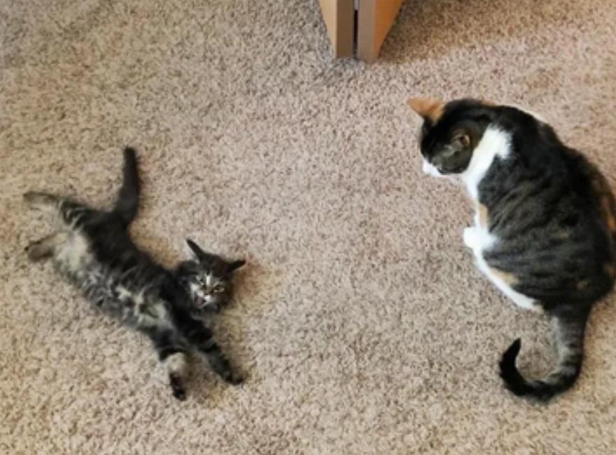 Το γατάκι προσαρμόστηκε αμέσως και μετά από μια εβδομάδα απογαλακτισμού, άρχισε να τρώει στερεά τροφή σαν μεγάλο γατάκι.
