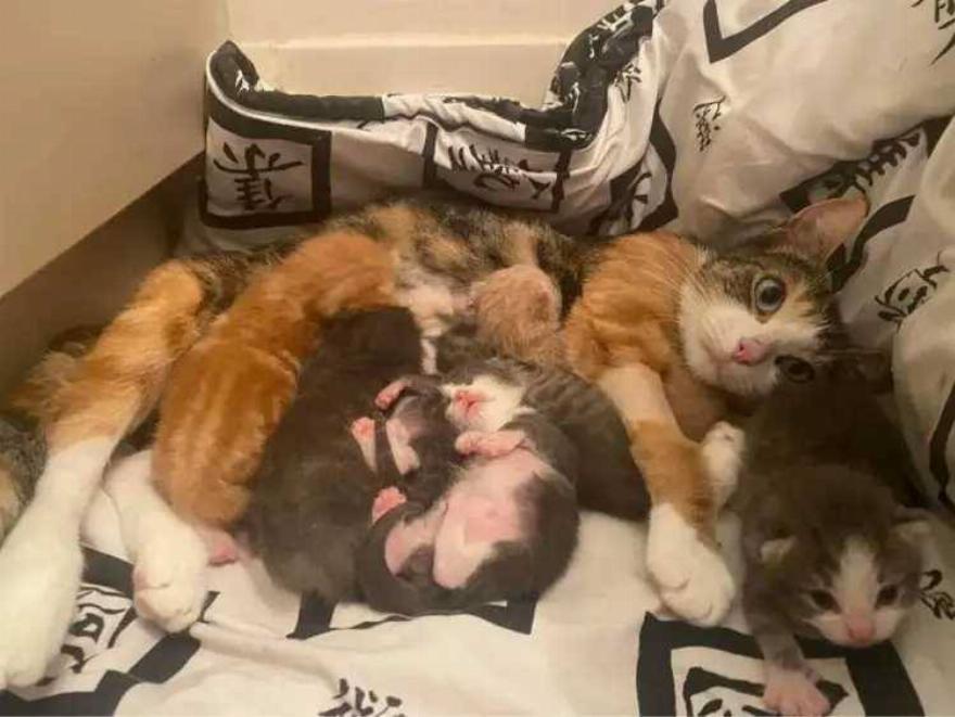 Πίστεψαν ότι είχε τελειώσει αφού γέννησε πέντε γατάκια, αλλά μια ώρα αργότερα βρέθηκαν έκπληκτοι όταν βρήκαν ένα έκτο μωρό. Επειδή η γάτα δεν ενδιαφερόταν να το καθαρίσει, το έκανε ο κηδεμόνας της.