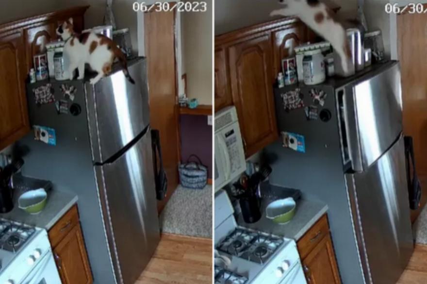 Η γάτα πηδάει από την κορυφή του καταψύκτη