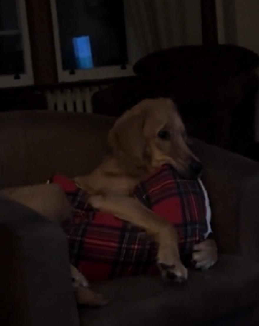 Στο βίντεο που μοιράστηκε στο TikTok την Κυριακή από τον ιδιοκτήτη της, Connor, με το όνομα χρήστη @elliestiktokfeed, το golden retriever φαίνεται ξαπλωμένο στην πολυθρόνα του μπροστά από την τηλεόραση να παρακολουθεί το Jurassic Park μαζί με τον ιδιοκτήτη της. Καθώς μια τρομακτική σκηνή εμφανίζεται στην οθόνη, η Ellie φαίνεται να αγκαλιάζει και να δαγκώνει το μαξιλάρι της, σαν να ψάχνει για λίγη ηθική υποστήριξη.