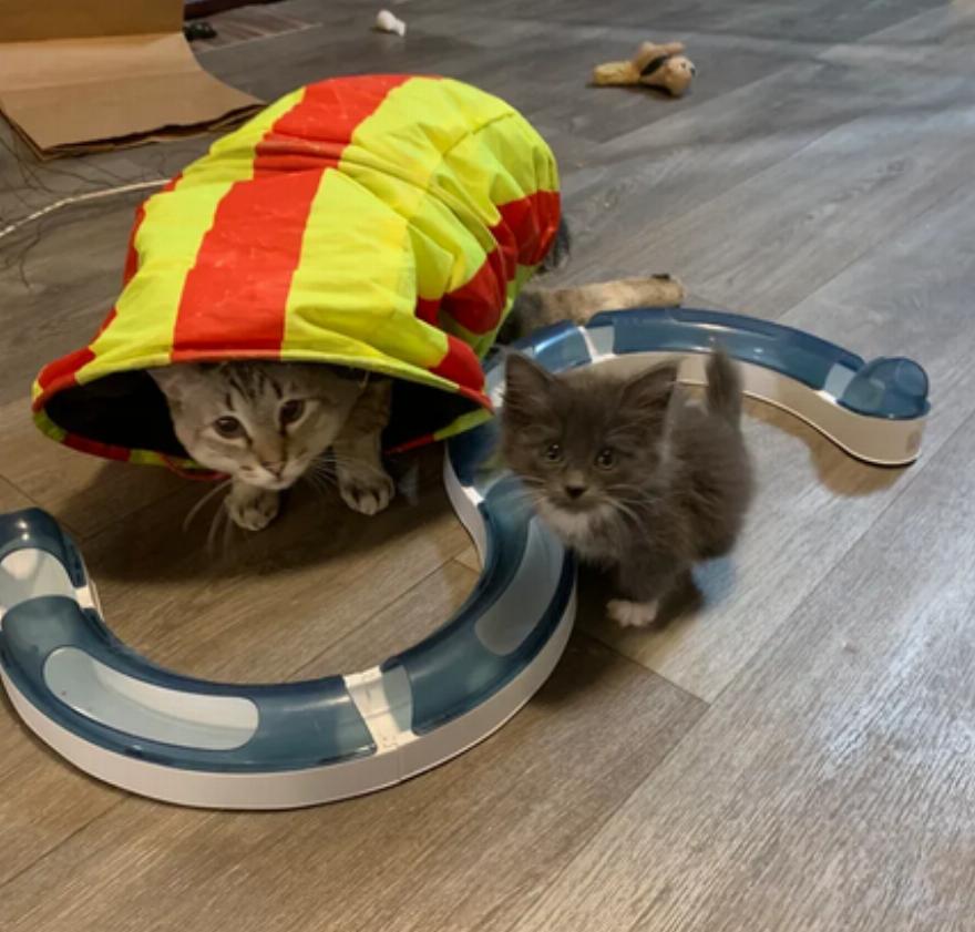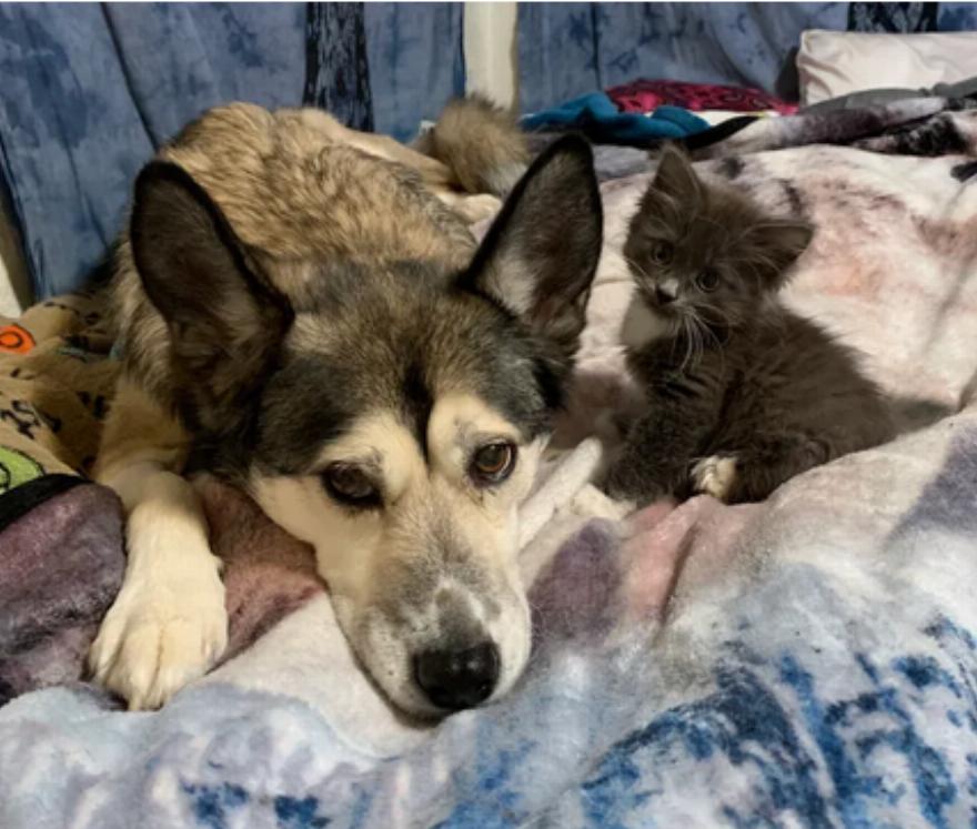 Η Cinder, η οποία έχει φιλοξενηθεί με πολλά γατάκια και κουτάβια, χάρηκε πάρα πολύ όταν είδε το νέο γατάκι. Κουνούσε την ουρά της από ενθουσιασμό.