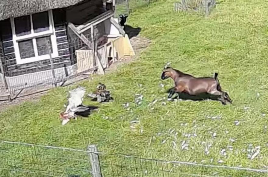 Λίγο μετά την έναρξη της επίθεσης του γερακιού, οι φίλοι της κότας – ένας κόκορας και μια κατσίκα – έσπευσαν να την προστατεύσουν και να διώξουν το γεράκι.
