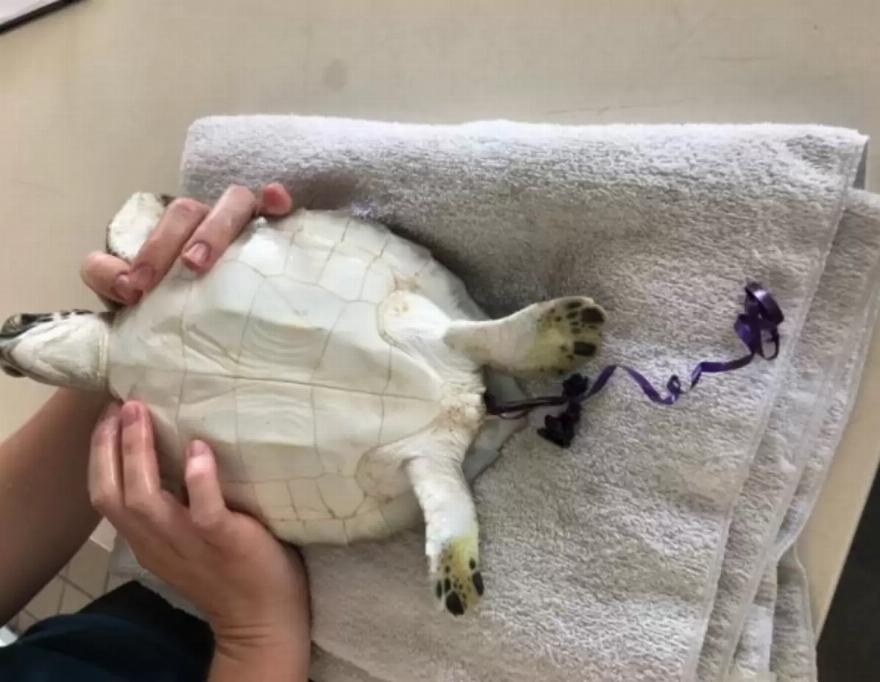 Ο Γουίλιαμς πλησίασε και συνειδητοποίησε ότι επρόκειτο για μια νεαρή θαλάσσια χελώνα Kemp’s ridley – με μια παχιά μάζα από μπερδεμένα κορδόνια μπαλονιού τυλιγμένα γύρω από το λαιμό της. Ένα ξεφούσκωτο κόκκινο μπαλόνι ήταν ακόμα συνδεδεμένο.