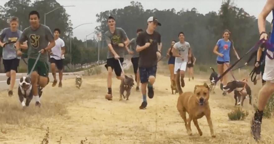 Mαθητές από το Γυμνάσιο του St Joseph Cross-Country Team στην Καλιφόρνια των Η.Π.Α. έφτιαξαν την πρωινή διάθεση σε μερικά τυχερά σκυλιά από το καταφύγιο. Τα πήραν μαζί τους στο καθημερινό τρέξιμο. Κάθε μαθητής είχε και έναν από τους σκύλους και η χαρούμενη ομάδα έκανε 2-3 χιλιόμετρα γύρω από το καταφύγιο των σκύλων, Santa Barbara County Animal.