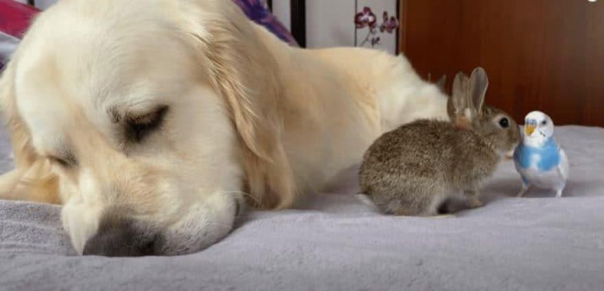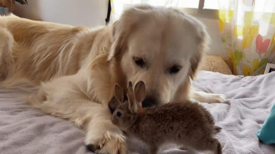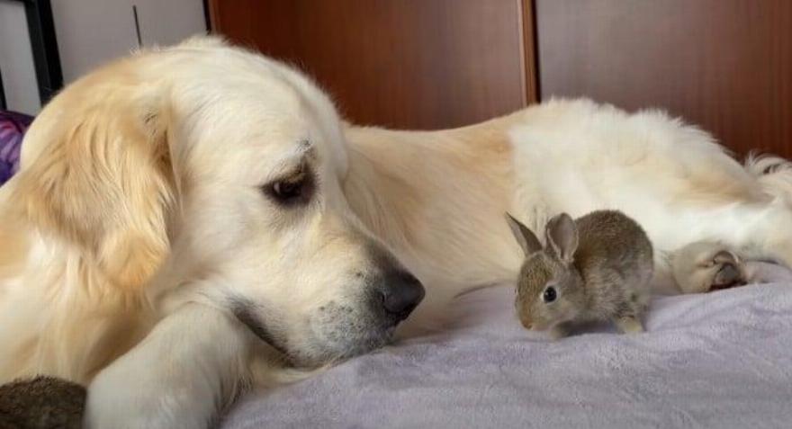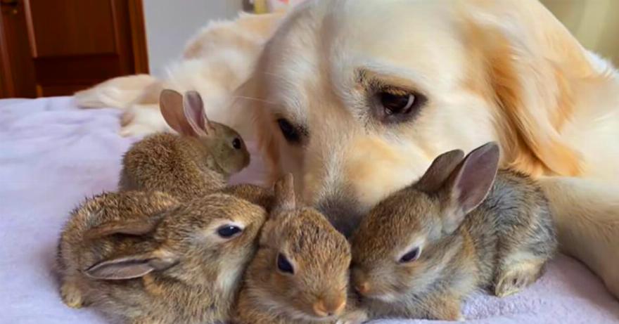 Ένα Γκόλντεν Ριτρίβερ που ονομάζεται Μπέιλι είναι πραγματικά χαρούμενο που παίζει με μερικά κουνέλια 20 ημερών, τα οποία νομίζουν ότι είναι η μαμά τους.