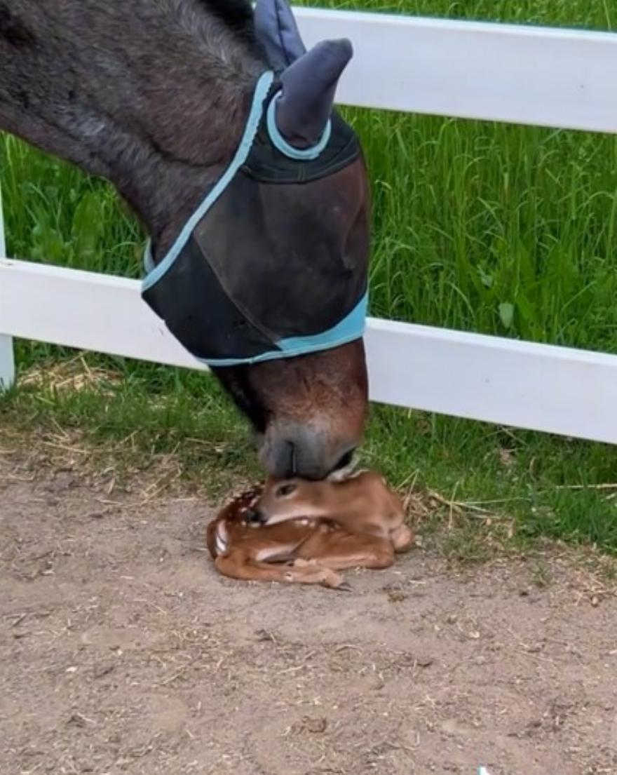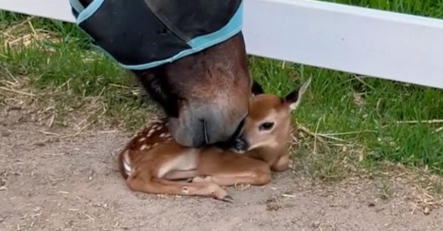 Το βίντεο δείχνει ένα μουστάνγκ να πλησιάζει μια ελαφίνα στην άκρη του μαντριού της. Με απόλυτη τρυφερότητα, το άλογο χαιρετά το μικρό πλάσμα, δείχνοντας έναν βαθύ δεσμό που προκαλεί δέος.
