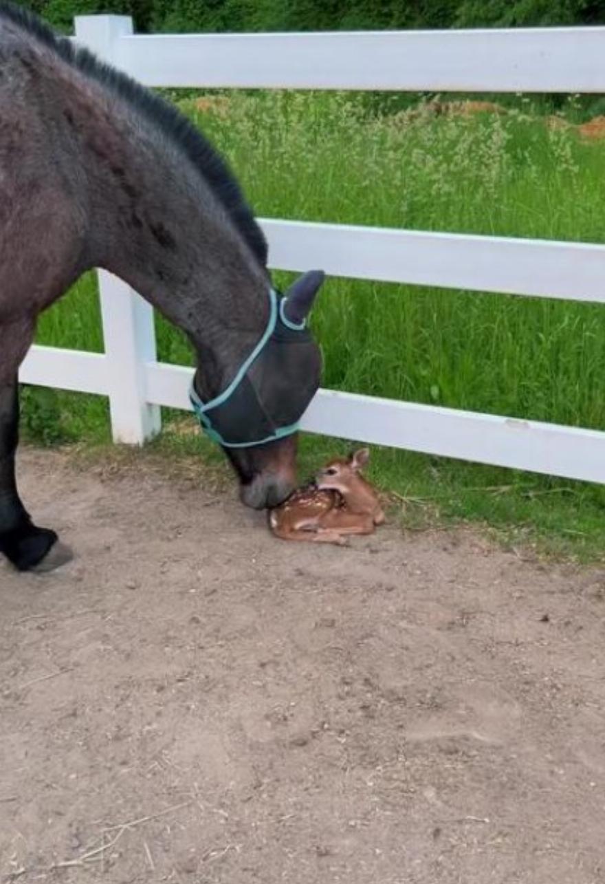 Η γλυκύτητα αυτής της συνάντησης είναι συγκλονιστική. Το μεγαλοπρεπές μουστάνγκ πλησιάζει ήρεμα το ελαφάκι και σπρώχνει απαλά το νεαρό αρσενικό με τη βελούδινη μύτη του. Το ελάφι απολαμβάνει το χάδι του με μια μακάρια έκφραση στο πρόσωπό του. Εκείνη τη στιγμή, το άλογο φαίνεται έτοιμο να δαμάσει το νεαρό ελάφι και να το πάρει πίσω στο καταφύγιό του στον αχυρώνα.