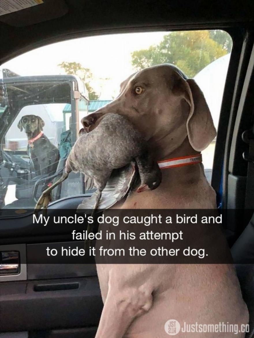 2. Ο σκύλος του θείου μου έπιασε ένα πουλί και απέτυχε στην προσπάθειά του να το κρύψει από τον άλλο σκύλο.