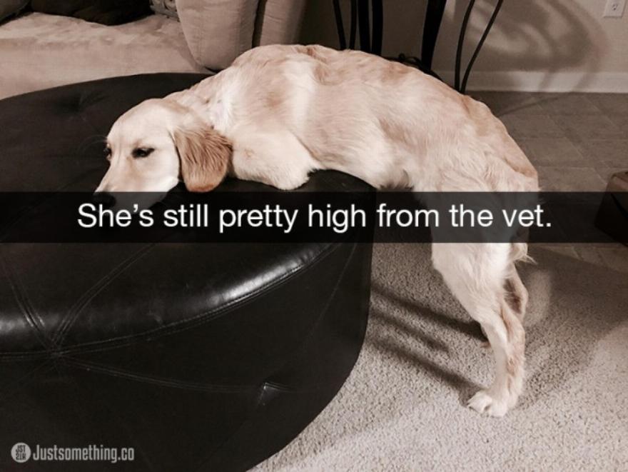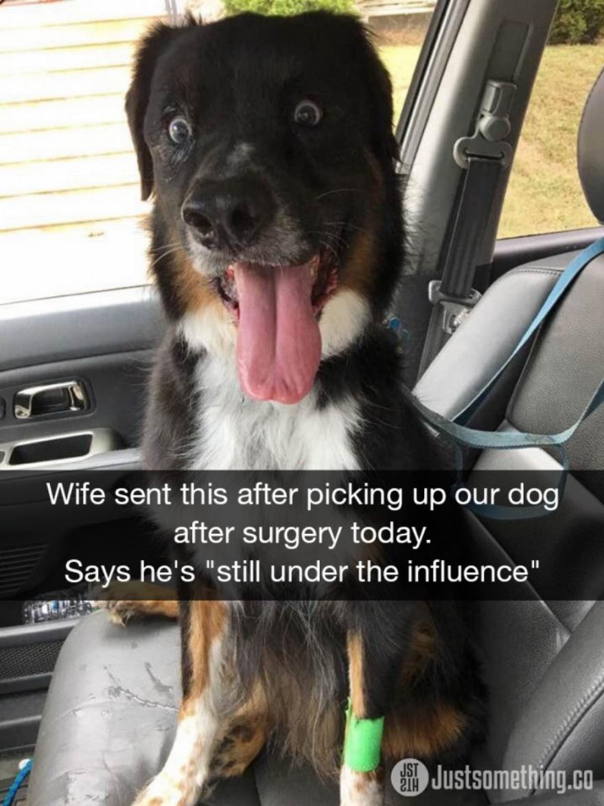 6. Η σύζυγος έστειλε αυτό μετά την παραλαβή του σκύλου μας μετά την εγχείρηση σήμερα. Λέει ότι είναι “ακόμα υπό την επήρεια”.