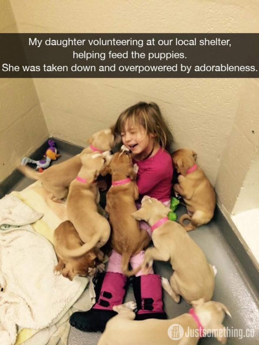 8. Η κόρη μου εργάζεται εθελοντικά στο τοπικό μας καταφύγιο, και βοηθάει στο τάϊσμα των κουταβιών. Την έριξαν κάτω και την κατέκλυσαν με την απόλυτη γλυκύτητα.