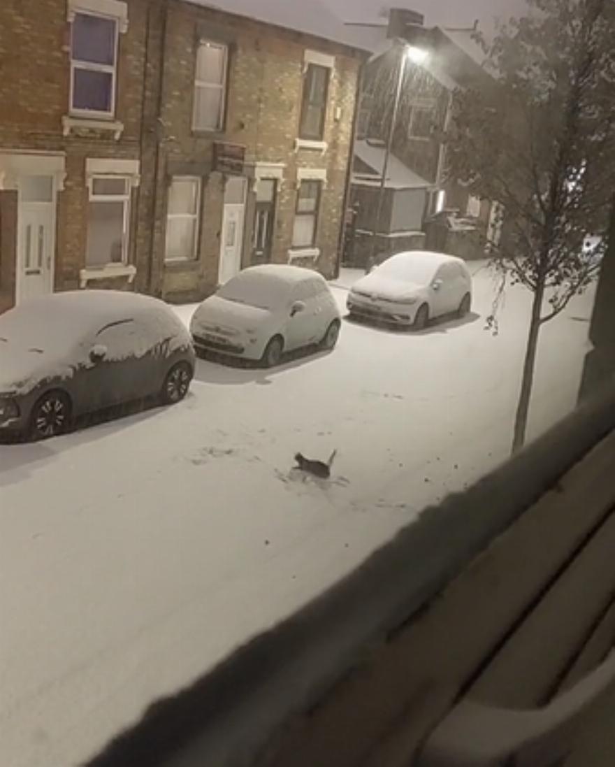 Η γλυκιά, αδέσποτη γάτα απαθανατίστηκε να τρέχει σε έναν δρόμο στο Ηνωμένο Βασίλειο, πηδώντας από χαρά καθώς έπεφτε το χιόνι.