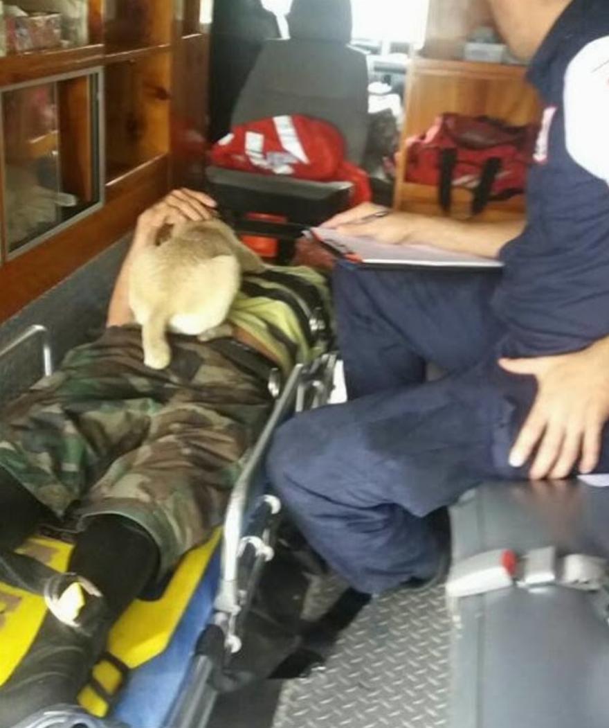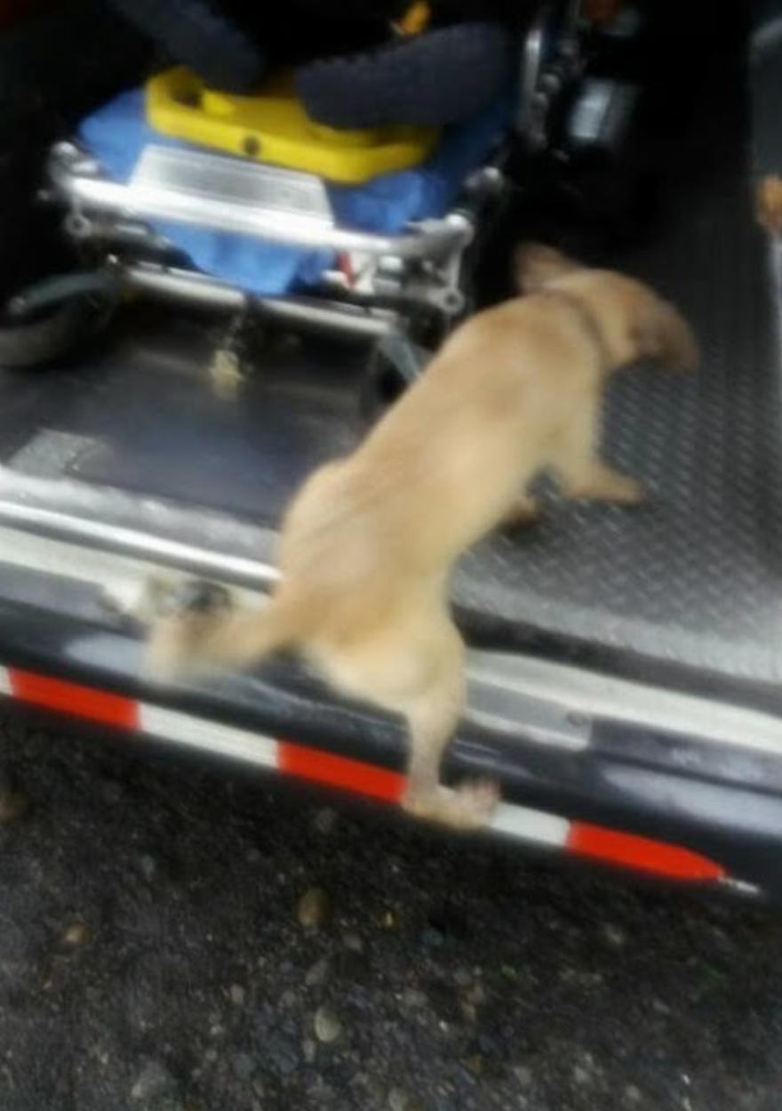 Οι νοσοκόμοι ήρθαν και μετέφεραν το άτομο στο όχημα, ο σκύλος πήδηξε επίσης μέσα, αλλά έπρεπε να τον διώξουν γιατί τα σκυλιά δεν επιτρέπονται στο όχημα.