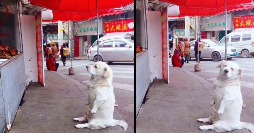 Ο έξυπνος σκύλος απεικονίζεται να κάθεται μπροστά από ένα περίπτερο με τηγανητό κοτόπουλο και να κοιτάζει ένα σωρό μαγειρεμένο κοτόπουλο σε μια σειρά ξεκαρδιστικών εικόνων.