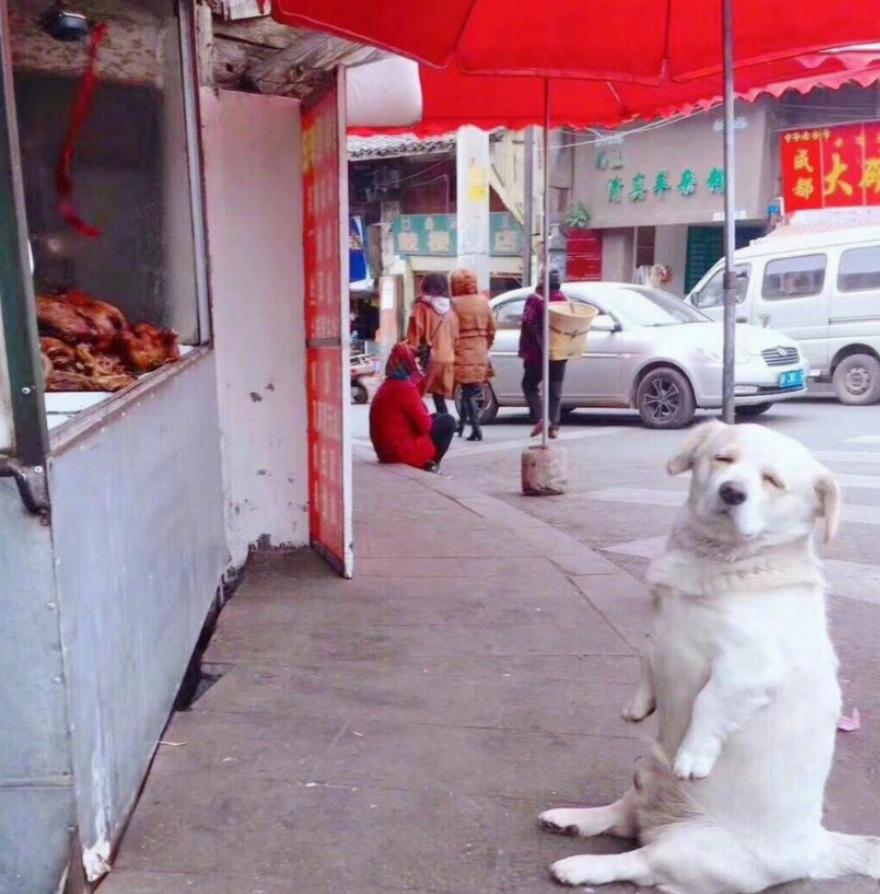 “Παρατήρησα αυτόν τον σκύλο να κάθεται μπροστά από έναν πάγκο με κοτόπουλο εστιάζοντας εντελώς το βλέμμα του στο φαγητό” περιγράφει μια λεζάντα. “Δεν έκανε καν. Έμεινε στη θέση του σαν φώκια”.