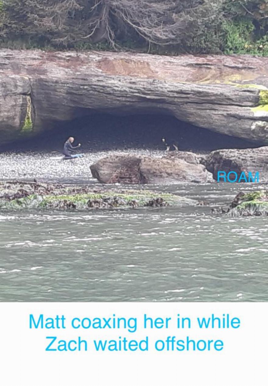 Μόλις έφτασαν στην ακτή, οι φίλοι φρόντισαν να κάνουν μπάνιο και να ταΐσουν το σκυλί. Επικοινώνησαν με τη Leslie Steeves, την ιδρύτρια του Reuniting Owners with Animals Missing (ROAM), για βοήθεια στον εντοπισμό της οικογένειας του σκύλου.