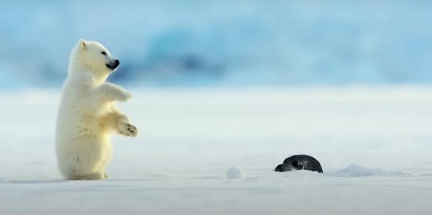 Αυτό είναι ένα από τα πιο χαριτωμένα βίντεο με ζώα, δείχνει ένα μικρό πολικής αρκούδας με ένα μωρό φώκια μπροστά του να δημιουργεί μια στιγμή τρόμου! Το βίντεο τραβήχτηκε από τύχη από το συνεργείο γυρισμάτων του BBC, το οποίο έκανε γυρίσματα για τη σειρά Snow Bears.
