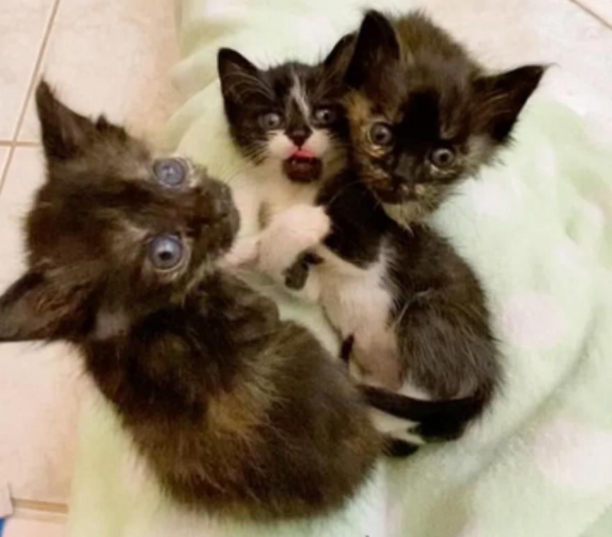Με τη βοήθεια πολλών εθελοντών, ο Charlie (ασπρόμαυρο), η Nova (tortie) και ο Suarez (tortie) επέζησαν και άρχισαν να ευημερούν. Τα μάτια τους άνοιξαν γύρω στη δεύτερη εβδομάδα και άρχισαν να χρησιμοποιούν τα πόδια τους για να βαδίζουν μόλις ήταν αρκετά δυνατά.