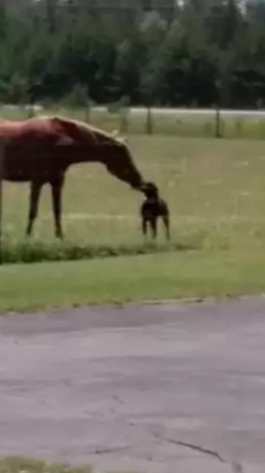 Κατά τη διάρκεια μιας επίσκεψης στη φάρμα ενός φίλου της, η Tina LeVoir-Jones κατέγραψε σε βίντεο αυτό που φαίνεται να είναι μια συνηθισμένη ρουτίνα μεταξύ του αλόγου και του κουταβιού.