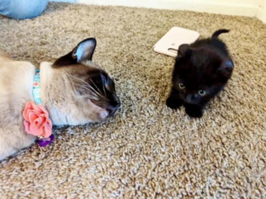 Το ζευγάρι έχει μια πανέμορφη διασωθείσα σιαμέζα, τη Charlotte, η οποία ήταν λίγο μπερδεμένη από τη μικροσκοπική νεοφερμένη. Αλλά η Domino έγινε η μεγαλύτερη θαυμάστριά της και πήγε κατευθείαν να τη χαιρετήσει.