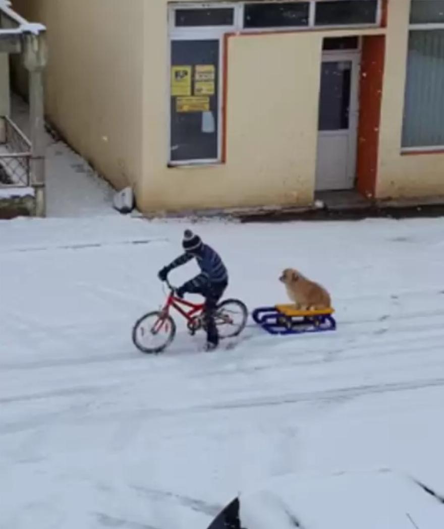 Για να εκμεταλλευτεί στο έπακρο το χιόνι, ο 12χρονος Andrei προσάρμοσε ένα έλκηθρο στο ποδήλατό του και ο σκύλος του Pufi ανέβηκε πάνω. Πιστός στο όνομα Pufi, το χνουδωτό τρίχωμα του σκύλου τον προστατεύει από τις κακές καιρικές συνθήκες, αλλά το μικρό κουτάβι έδειχνε ευγνώμων που έπαιζε με τον άνθρωπό του και δεν χρειαζόταν να βρέξει τις πατούσες του.