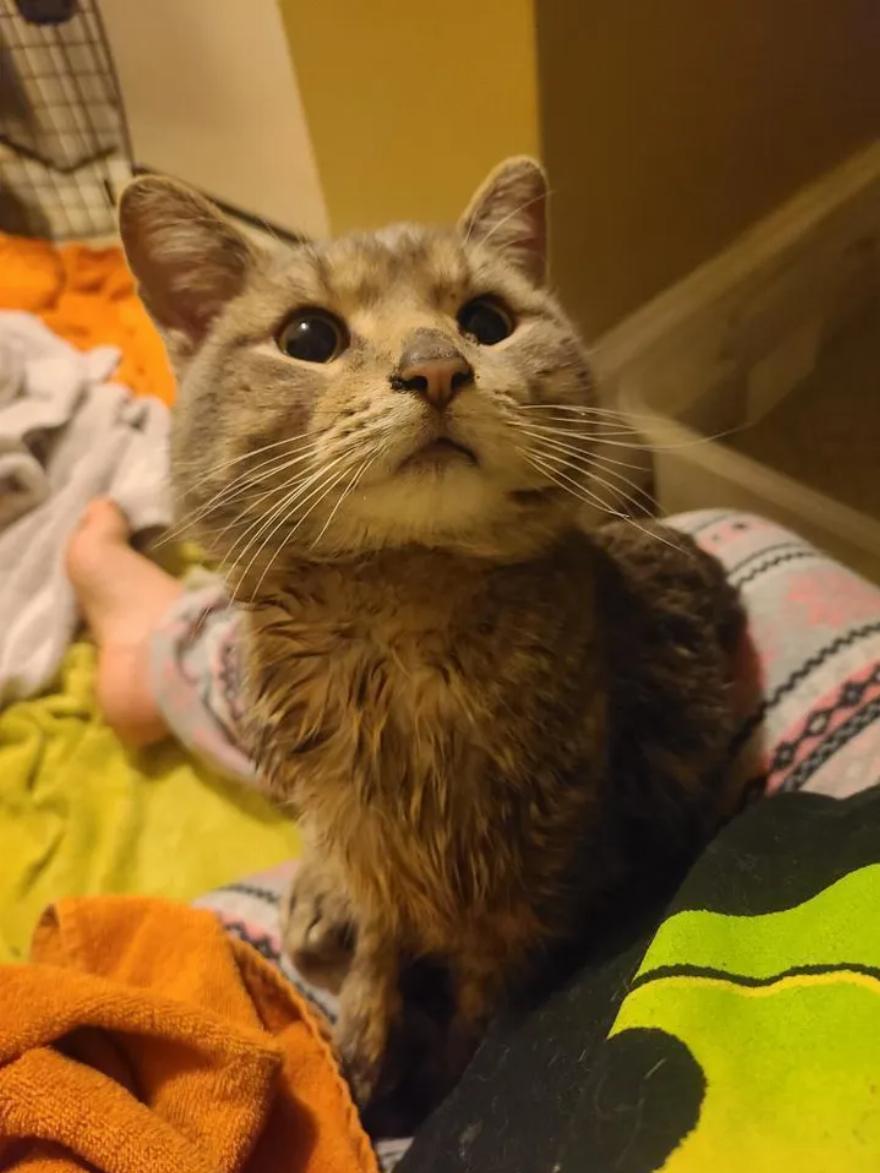 Ο γάτος ήταν πολύ κοκαλιάρης, αφυδατωμένος και πεινασμένος. Μόλις του δόθηκε ένα μπολ με φαγητό, το καταβρόχθισε μέσα σε ένα λεπτό.