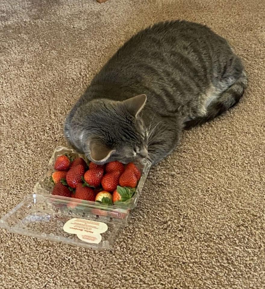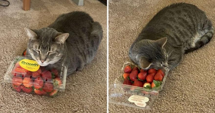 Προφανώς, για κάποιο λόγο, η 10χρονη γατούλα έδειχνε εντελώς γοητευμένη από το κουτί με τα κόκκινα, ζουμερά μούρα.