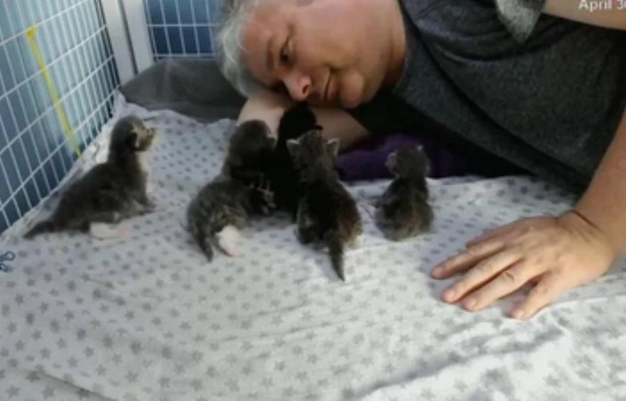 Ένας άνδρας που έχει αναλάβει την αναδοχή για 10 χρόνια, πήρε την εξαμελή οικογένεια στο σπίτι, ώστε η μαμά γάτα να έχει ένα ασφαλές και άνετο μέρος για να μεγαλώσει τα μωρά της.