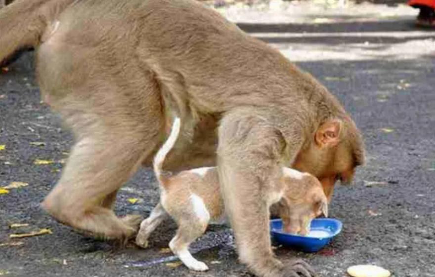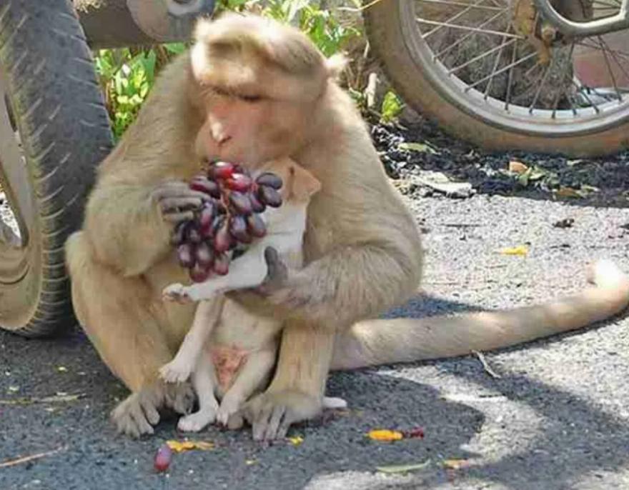 Το αφήνει ακόμη και να φάει πρώτο. Όταν το κουτάβι χορτάσει, τότε εκείνη τρώει ότι περίσσεψε. Μια μαϊμού υιοθέτησε ένα αδέσποτο κουτάβι, το προστατεύει από τα σκυλιά και το αφήνει να τρώει πρώτο.