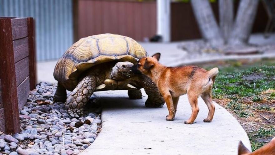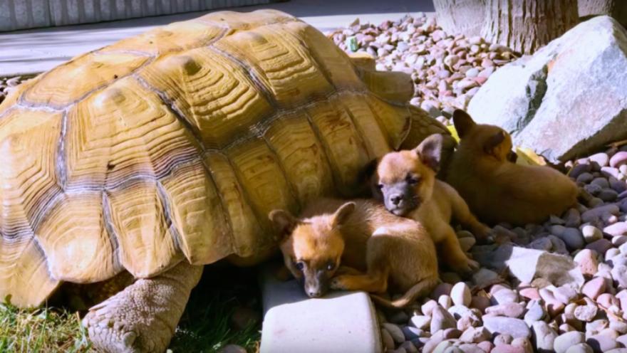 Τα περισσότερα σκυλιά θα τρομοκρατούνταν ή θα αγνοούσαν μια χελώνα, αλλά σίγουρα όχι αυτά τα τρία κουτάβια. Η χελώνα και τα κουτάβια βρήκαν καλή φιλία μεταξύ τους και χαιρόμαστε γι’ αυτά!