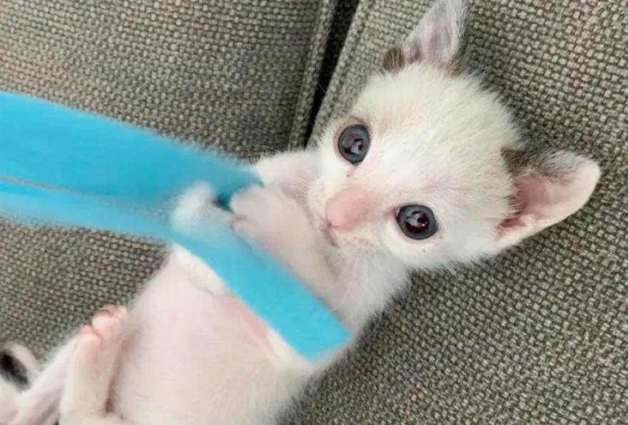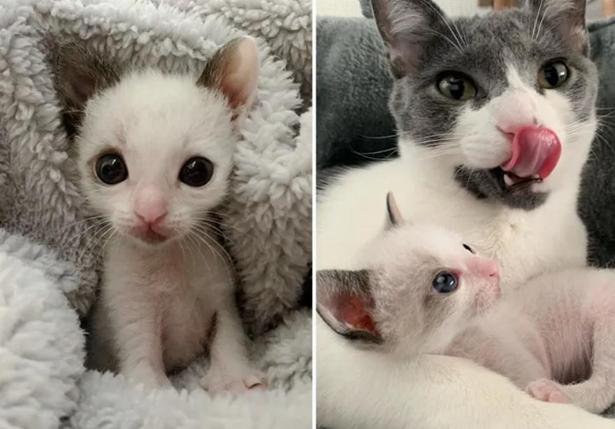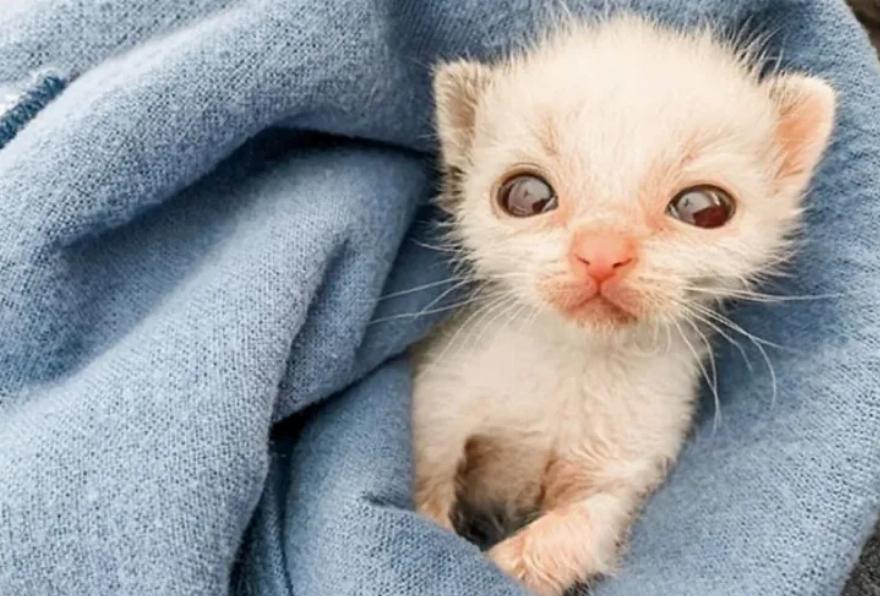 Σε ηλικία πέντε εβδομάδων, το γατάκι είχε μόνο το μέγεθος δύο εβδομάδων. Το σώμα του φαινόταν μικροσκοπικό σε σύγκριση με αυτά τα μεγάλα, μπλε μάτια.