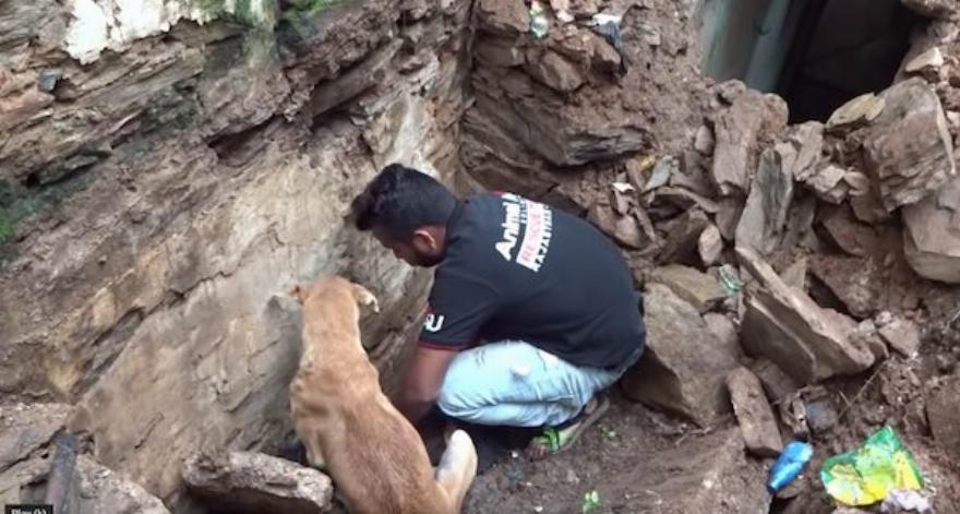 Οι διασώστες και η μητέρα σκυλίτσα σκάβουν εναλλάξ για να απελευθερώσουν τα κουτάβια της.