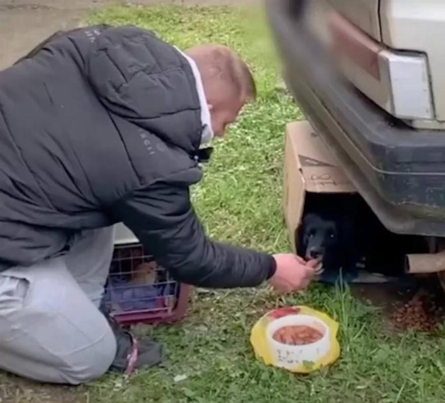 Αρχικά, παρέχει στο μητρικό σκυλί λίγη τροφή. Μπορείτε να φανταστείτε πόσο δύσκολο θα ήταν για εκείνη να σας αφήσει για να βρει μόνη της φαγητό. Αρχίζει να τρώει και παίρνει το φαγητό κατευθείαν από το χέρι του, ένα σημάδι ότι έχει αρχίσει να τον εμπιστεύεται. Μετά από λίγο, προσπάθησε να της φορέσει το λουρί, αλλά εκείνη δεν ήθελε να το φορέσει και αντ’ αυτού έτρεξε έξω.