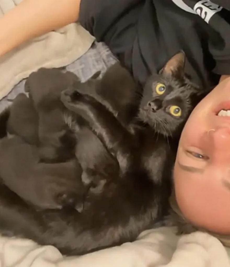 Εκείνη πήρε αμέσως το μοναχικό γατάκι και άρχισε να το φροντίζει