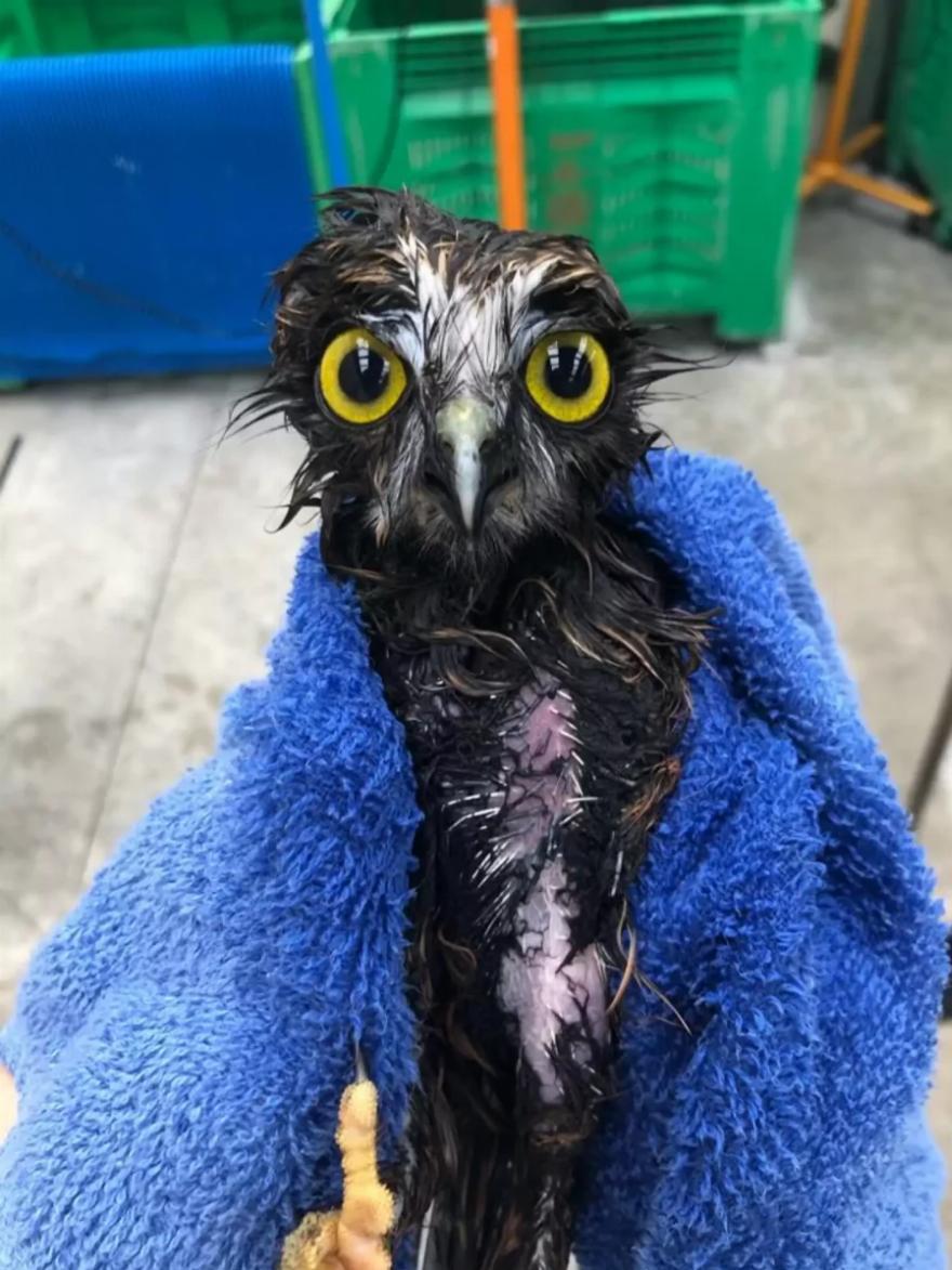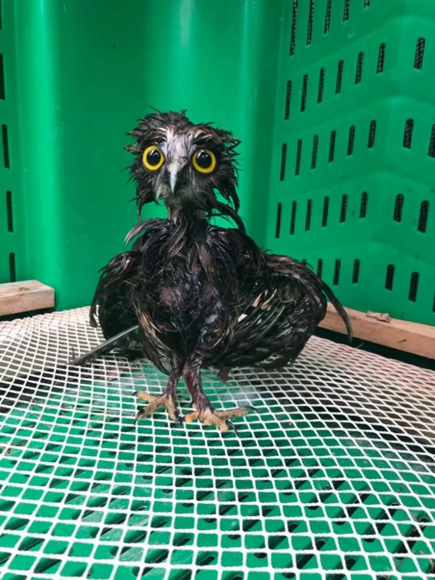Η κουκουβάγια πλύθηκε με χλωρεξιδίνη για την αντιμετώπιση της μόλυνσης και στη συνέχεια ξεπλύθηκε καθαρά. “ΔΕΝ ήταν ευχαριστημένη”, έγραψε ο Nijman.