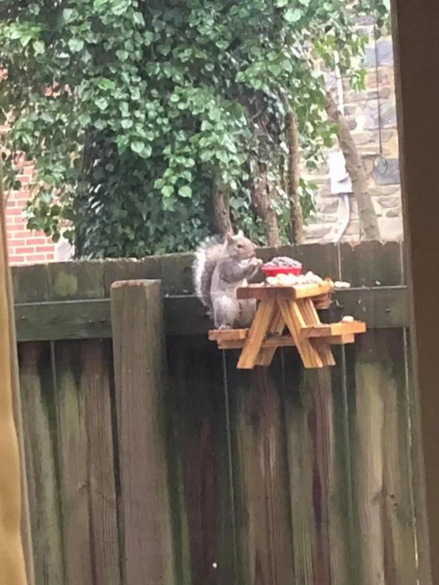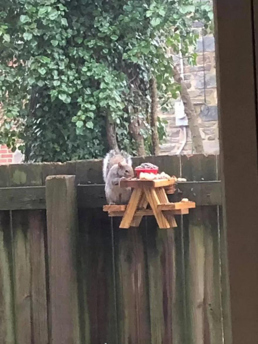Έτσι, χρησιμοποιώντας μερικά ξύλα που είχε πεταμένα τριγύρω, αποφάσισε να κατασκευάσει ένα μικροσκοπικό τραπέζι πικνίκ γι’ αυτά, καρφώνοντάς το στον φράχτη του στο πίσω μέρος του σπιτιού του.