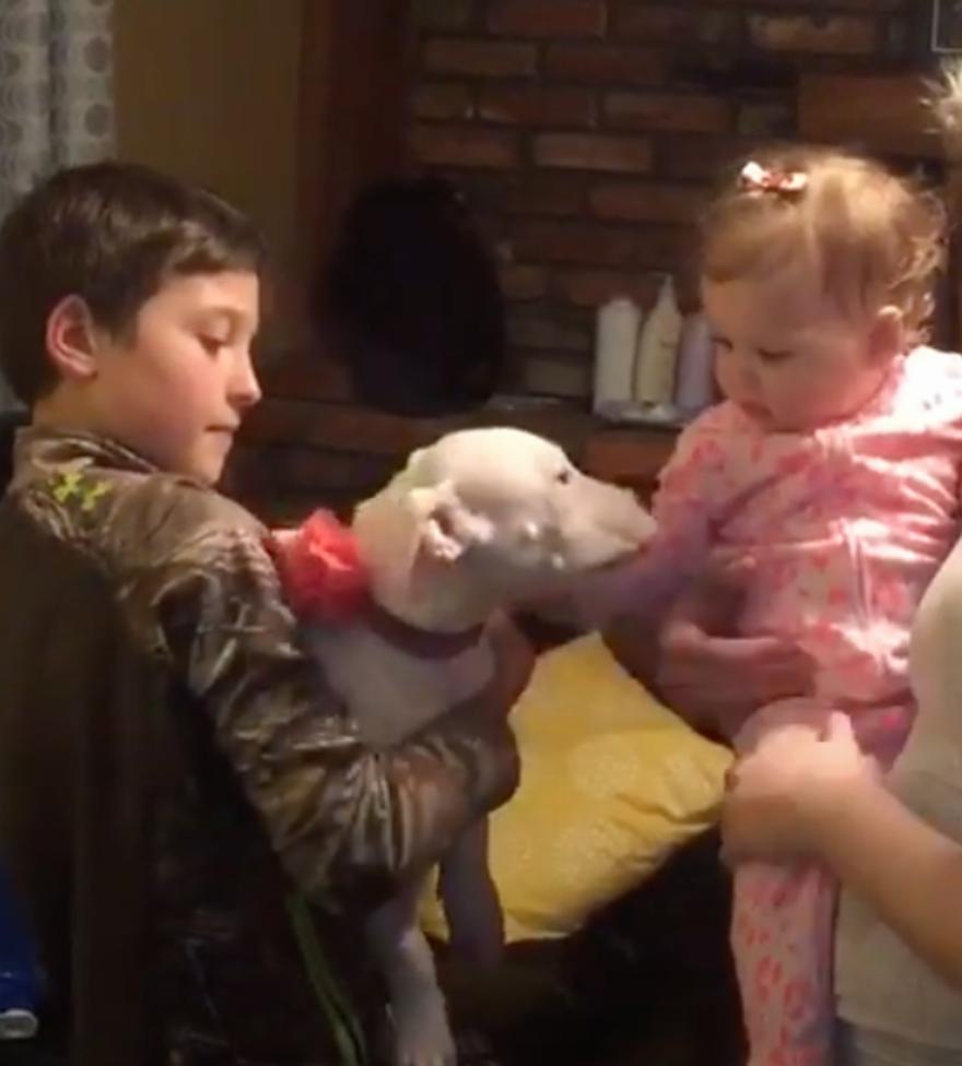 Στην πραγματικότητα, η οικογένειά της την υιοθέτησε εν μέρει λόγω του πόσο γλυκιά ήταν η μίξη πιτ μπουλ με την 11 μηνών κόρη τους.
